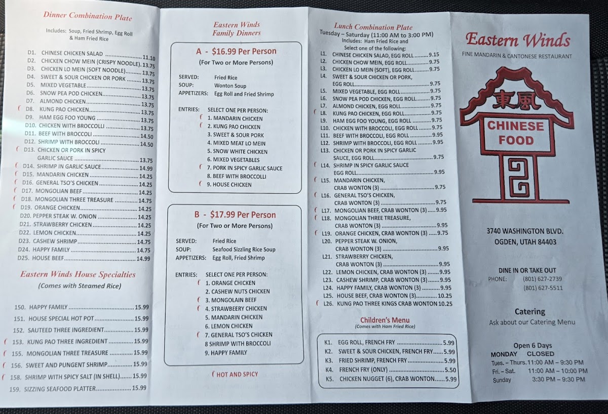 Looking for a dining experience that combines bold flavors with a welcoming atmosphere? Look no further than Eastern Winds Restaurant Menu, located at 3740 S Washington Blvd in Ogden, UT. Whether you're a fan of classic favorites or looking to try something new, this menu offers a delightful variety. From savory appetizers to satisfying main courses, each dish is crafted with care and a hint of Eastern flair. The menu brings together traditional ingredients with unique spices that are sure to transport your taste buds to another place. Whether you're in the mood for a hearty meat dish or something lighter, there's something to satisfy every craving. Plus, their specials offer a rotating selection of seasonal items, ensuring every visit is a fresh experience. So come hungry and explore the wide range of flavors waiting for you at Eastern Winds.